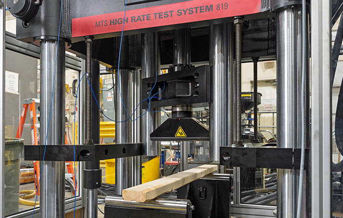A high strain rate test determines material properties across various test speeds (up to 20 m/s) to simulate high speed impact events.