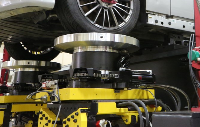 Die neue Lenkeingabebaugruppe ist in einem Linear-zu-Drehbewegungsdesign ausgeführt, das aus zwei Linearzylindern und einem um eine K&C-System-Kraftmessdose gewickelten Kettenantrieb besteht, um präzise Drehlenkbewegungen an die Reifenauflagen oder Spindeln des Fahrzeugs zu übertragen. Die optimierte Leistung umfasst Folgendes: