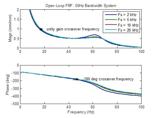Quando la frequenza di campionamento viene aumentata da 2 kHz a 5 kHz, si verifica una riduzione moderata del picco della risposta in frequenza ad anello aperto.Anche le metriche di stabilità (frequenze di crossover) sono moderatamente migliorate (frequenza più alta).Oltre a ciò, il miglioramento che è possibile ottenere è limitato: