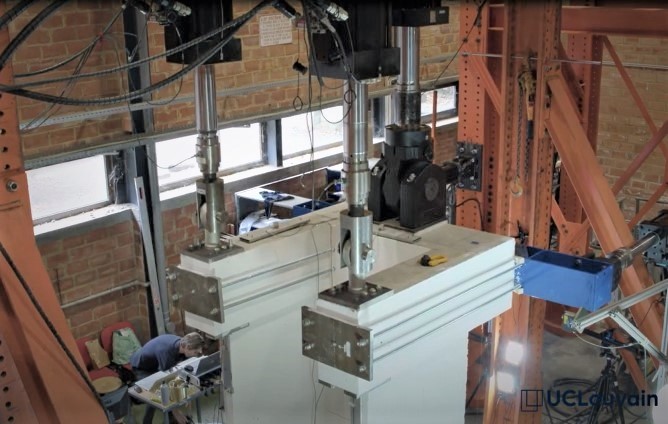 Gli esperimenti di UCLouvain hanno sottoposto tre unità di muri centrali in cemento armato a scala ridotta a diversi test: carico laterale (spinta-tirata); torsione attorno all'asse verticale; e una combinazione di spinta, tirata e torsione.