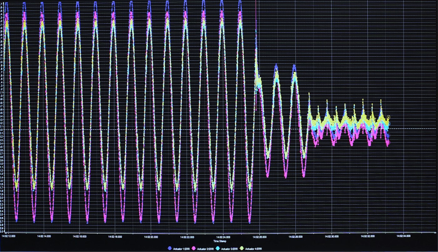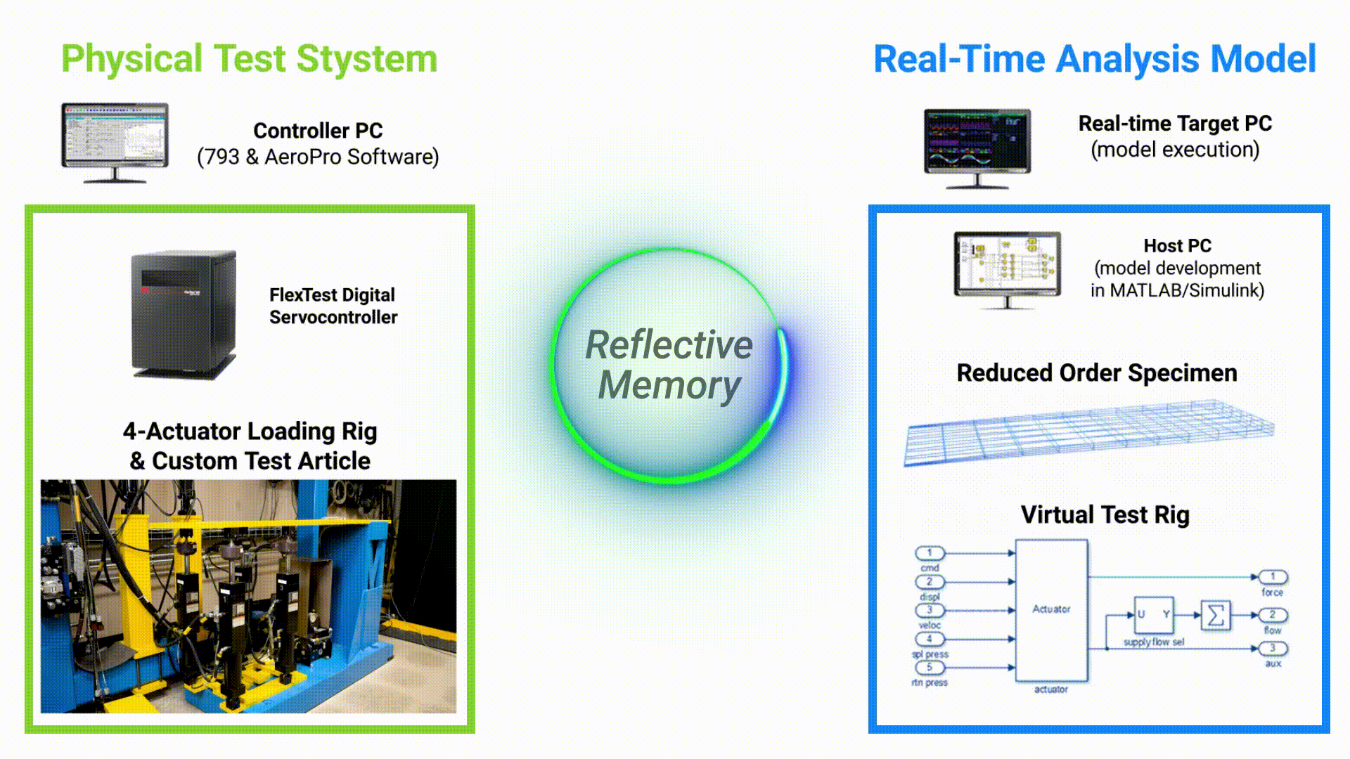Los comandos de la válvula necesarios para corregir los errores fluyen desde el modelo de análisis y se ejecutan en el banco de prueba físico. Los señales de fuerza y desplazamiento fluyen del banco de prueba de regreso al modelo, y el proceso se repite en cada intervalo del reloj.